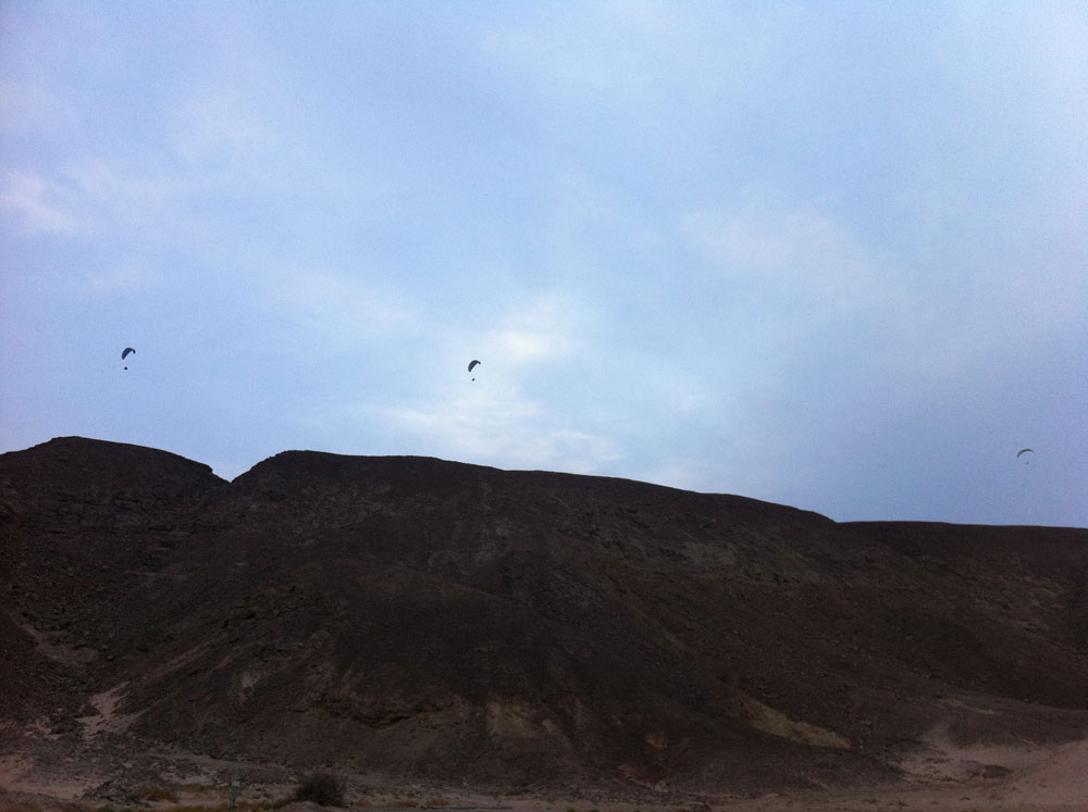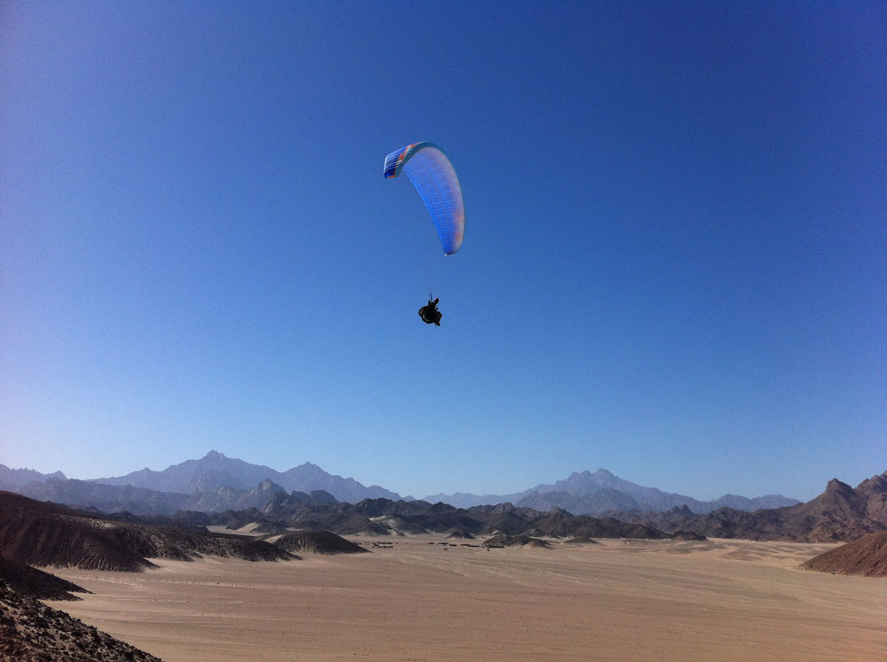 Our 'home mountain', located west of the Sinai Peninsula over the metropolitan area of Hurghada and El Gouna, is the starting point of our tour, easily accessible within 20 minutes by our Jeeps. A laminar wind provides excellent soaring conditions along the massive mountain ranges of the Red Sea and invites, especially in the evenings for long flights. The lunch hours are often characterized by strong thermal winds, which can be generally relied on to ease in the evenings.